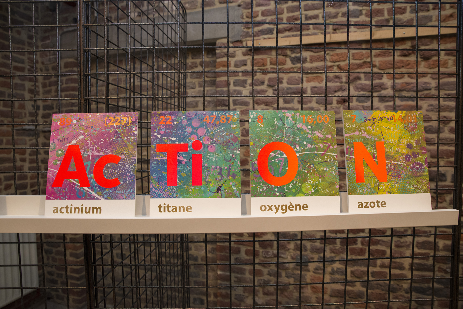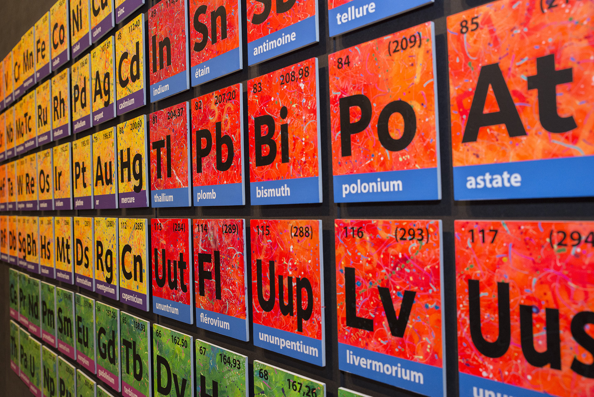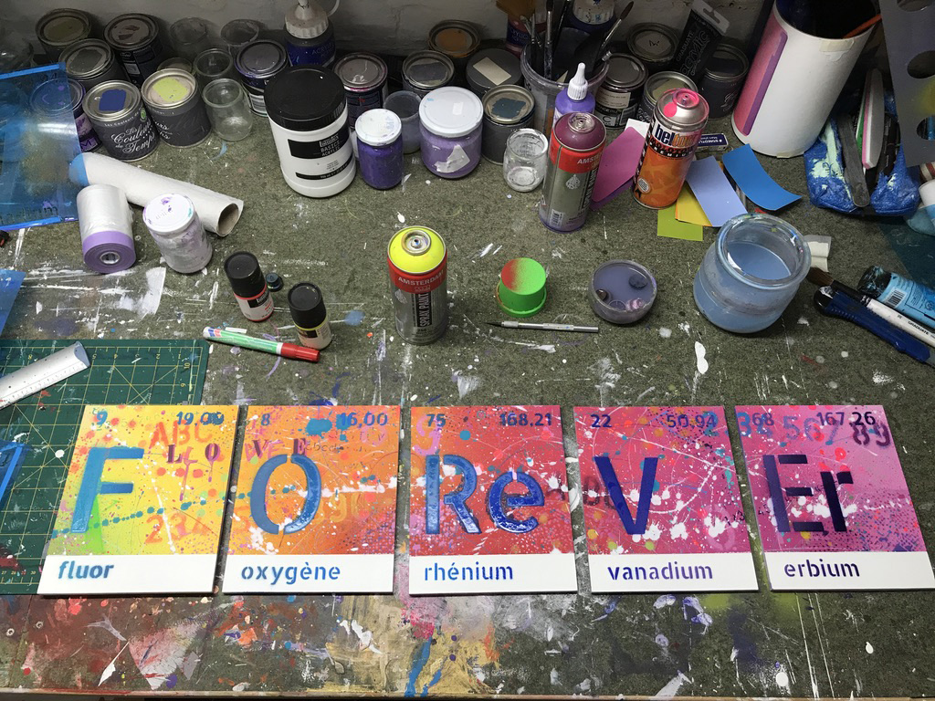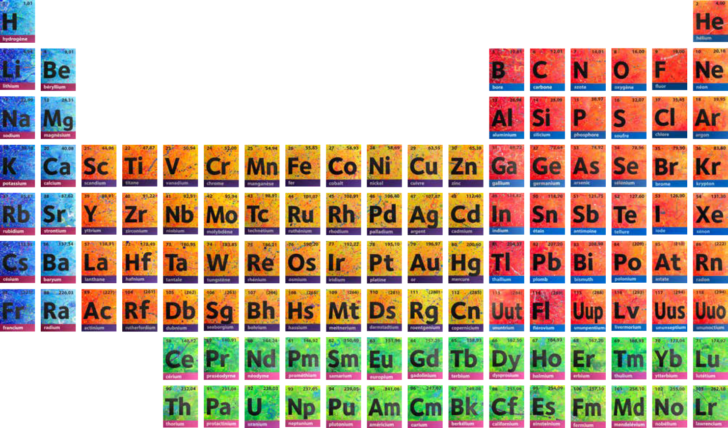 C’est la rencontre avec un dirigeant d’une société belge active dans le domaine scientifique, conjuguée avec le 150naire du tableau de Mendeleïev, qui a donné naissance à ce projet de tableau périodique basé sur mes recherches graphiques. J’ai travaillé ce tableau pour que l’on capte l’énergie des différentes composantes des éléments qui le constituent (électrons, protons, neutrons, masse, …). Entre 2 et 3D, il les symbolise par d’infinies traces qui s’entremêlent avec énergie et liberté. Les couleurs, la lumière et leur interaction emmènent l’œil à différents niveaux de lecture, de regards. La mixité des techniques utilisées (bois, acrylique, pochoirs, aérosol, découpe laser, etc.) se veut, elle aussi, le reflet de la variété des éléments et de leurs propriétés.