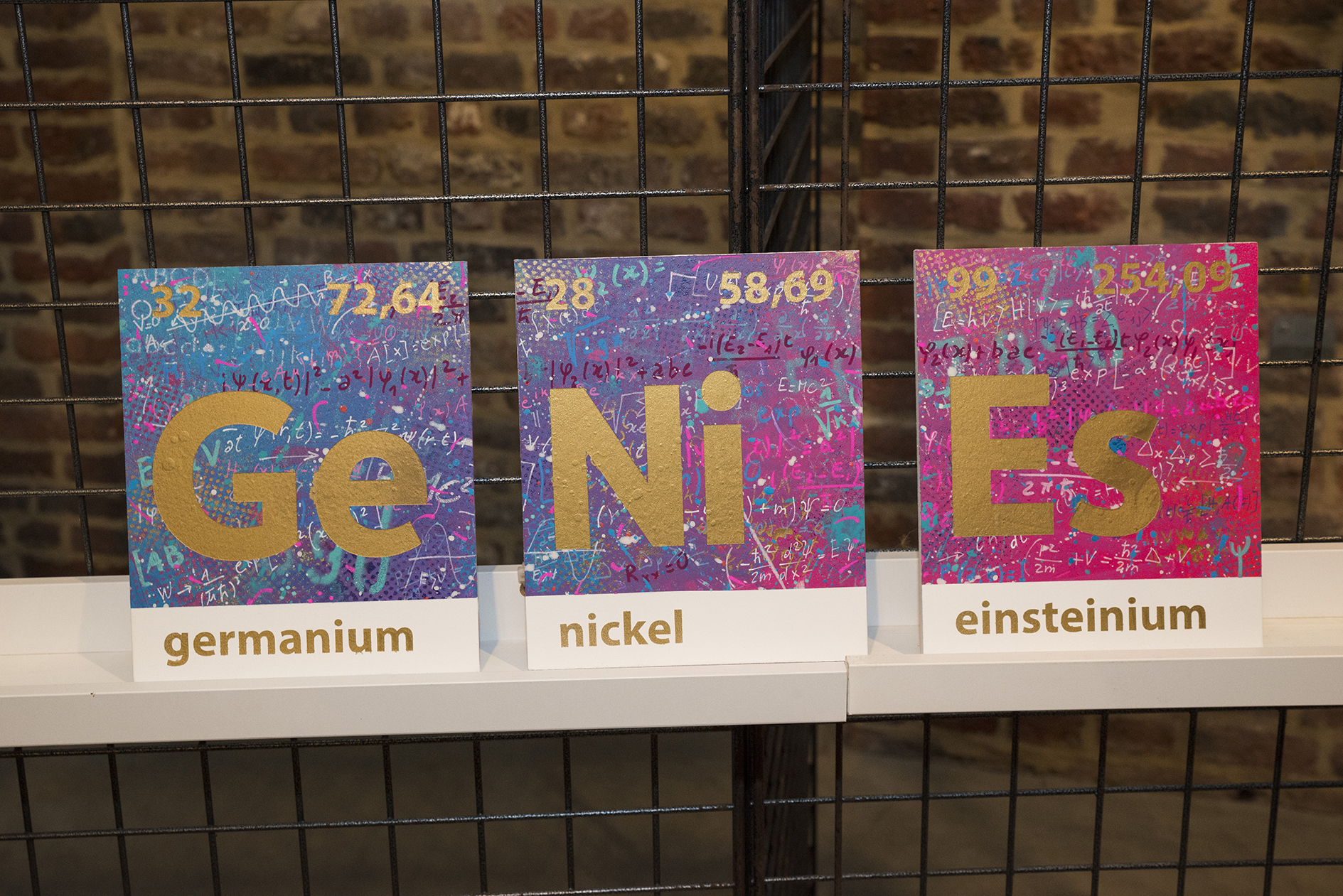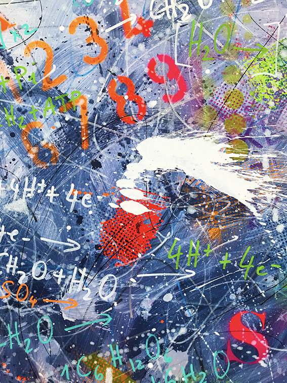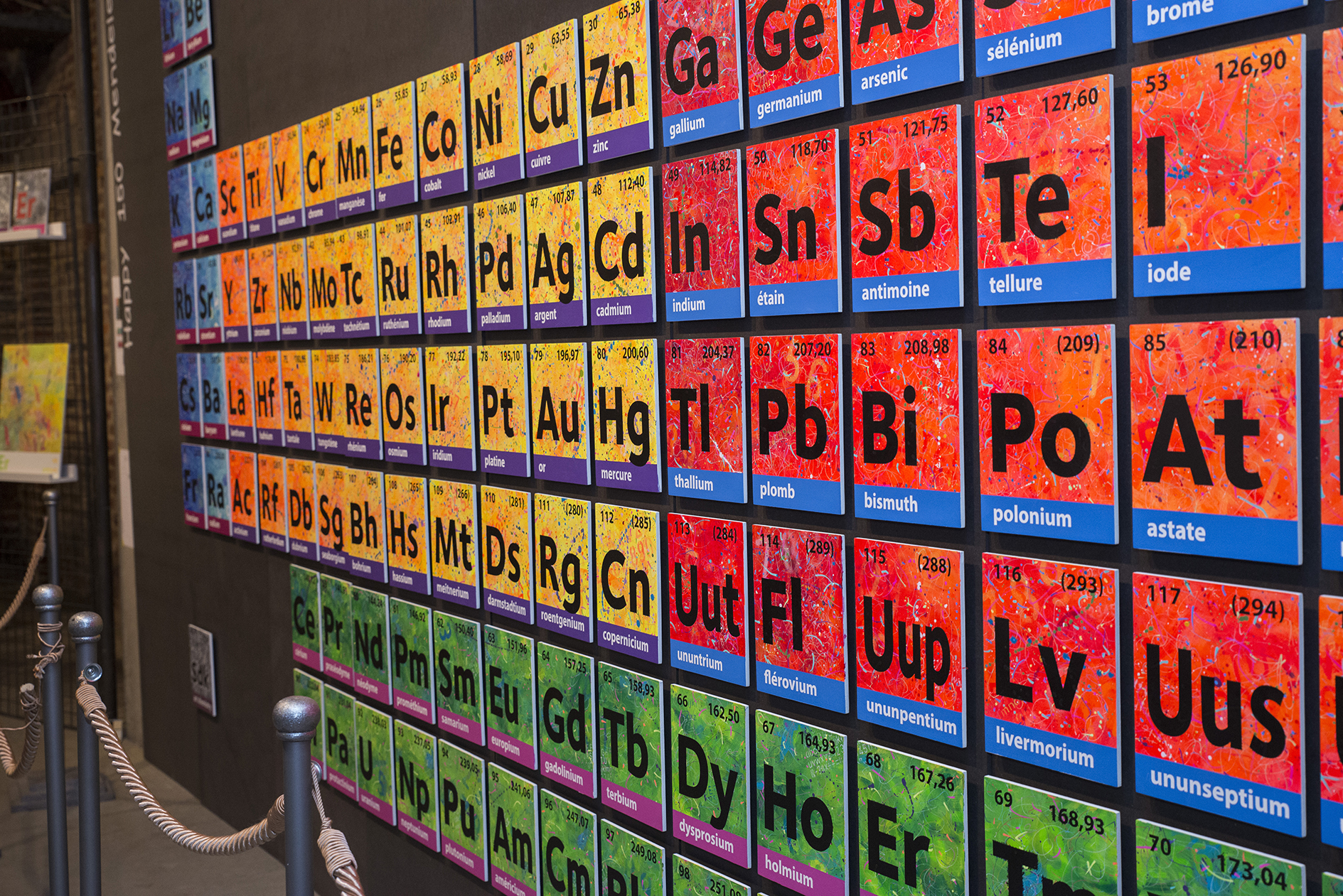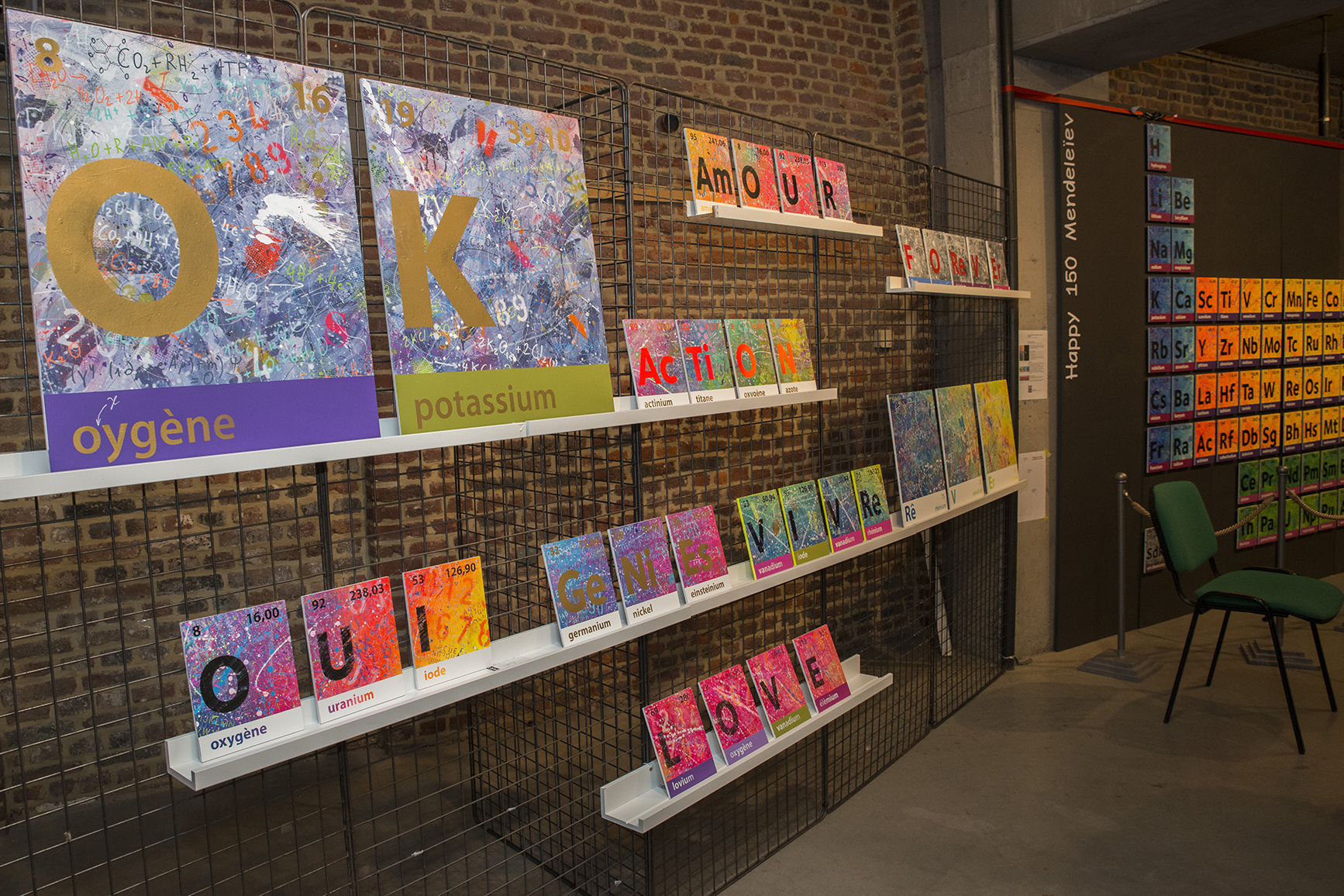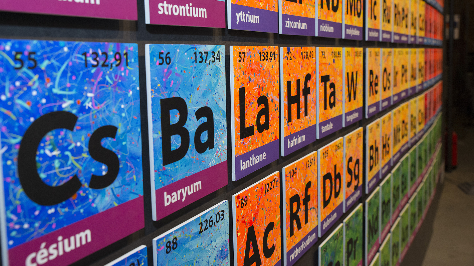 C’est la rencontre avec un dirigeant d’une société belge active dans le domaine scientifique, conjuguée avec le 150naire du tableau de Mendeleïev, qui a donné naissance à ce projet de tableau périodique basé sur mes recherches graphiques. J’ai travaillé ce tableau pour que l’on capte l’énergie des différentes composantes des éléments qui le constituent (électrons, protons, neutrons, masse, …). Entre 2 et 3D, il les symbolise par d’infinies traces qui s’entremêlent avec énergie et liberté. Les couleurs, la lumière et leur interaction emmènent l’œil à différents niveaux de lecture, de regards. La mixité des techniques utilisées (bois, acrylique, pochoirs, aérosol, découpe laser, etc.) se veut, elle aussi, le reflet de la variété des éléments et de leurs propriétés.