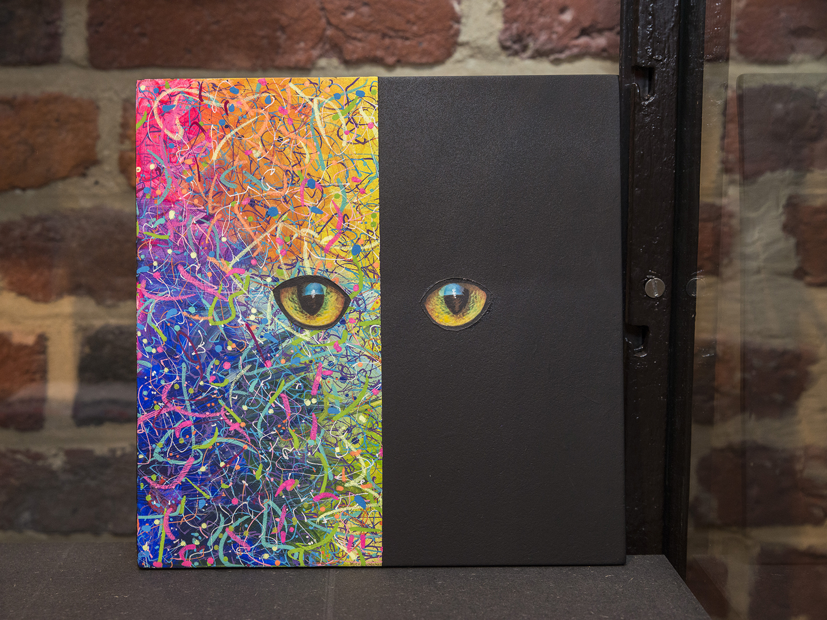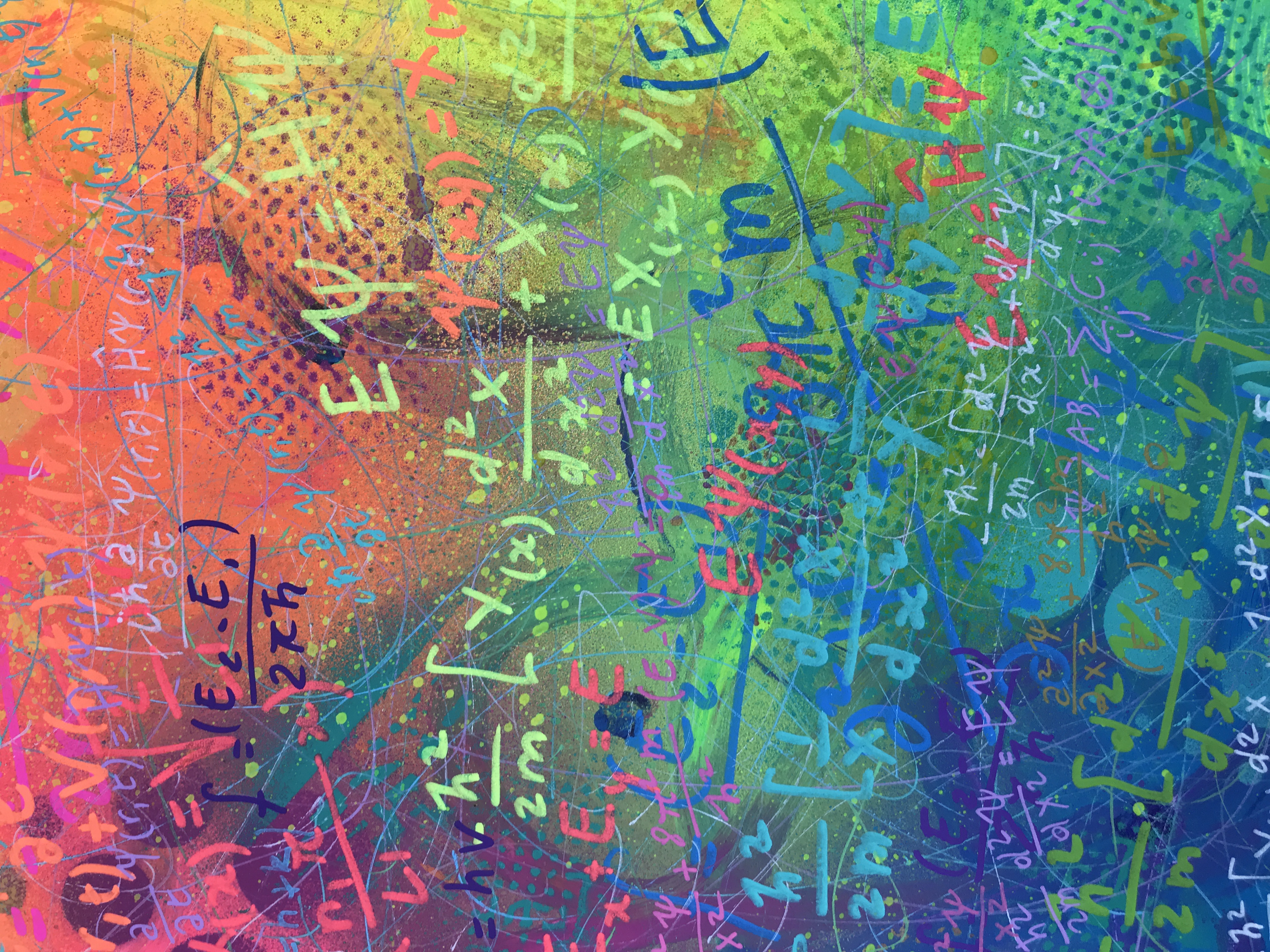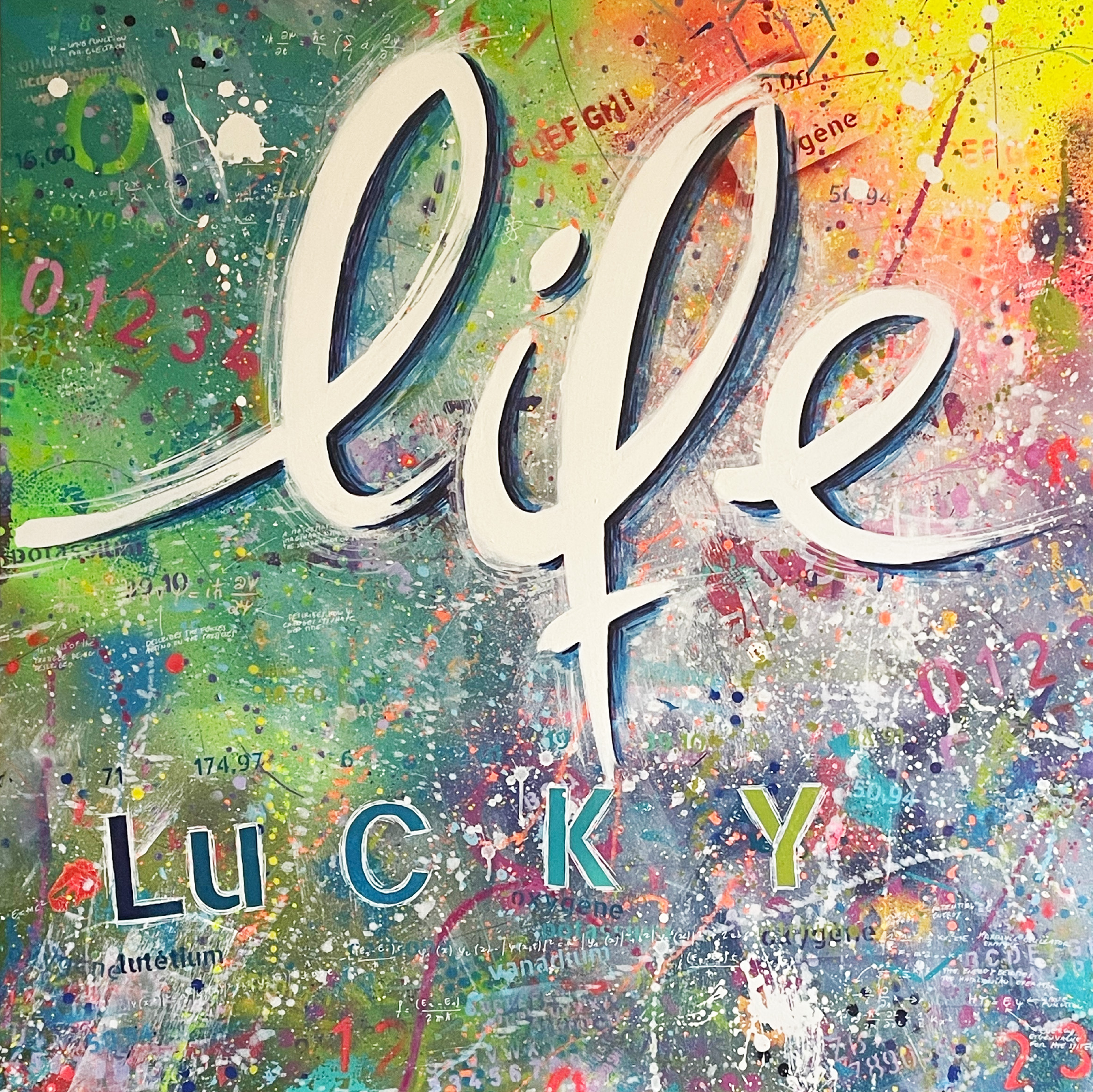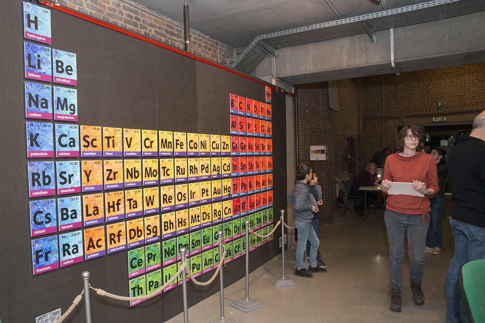 C’est la rencontre avec un dirigeant d’une société belge active dans le domaine scientifique, conjuguée avec le 150naire du tableau de Mendeleïev, qui a donné naissance à ce projet de tableau périodique basé sur mes recherches graphiques. J’ai travaillé ce tableau pour que l’on capte l’énergie des différentes composantes des éléments qui le constituent (électrons, protons, neutrons, masse, …). Entre 2 et 3D, il les symbolise par d’infinies traces qui s’entremêlent avec énergie et liberté. Les couleurs, la lumière et leur interaction emmènent l’œil à différents niveaux de lecture, de regards. La mixité des techniques utilisées (bois, acrylique, pochoirs, aérosol, découpe laser, etc.) se veut, elle aussi, le reflet de la variété des éléments et de leurs propriétés.
